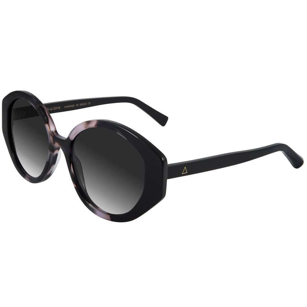 Γυναικεία χειροποίητα γυαλιά ηλίου Zeus + Dione, ελληνικής κατασκευής, σε οβάλ σχήμα, με ταρταρούγα-μαύρο κοκκάλινο σκελετό και γκρι degrade χρώμα φακών. Διαθέτουν φακούς της εταιρείας ZEISS.